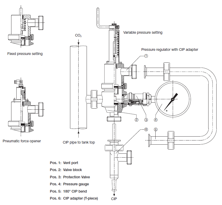 The pressure regulator tank requires cleaning between every batch. It is incorporated into the tank CIP procedure by means of the optional CIP adaptor. Before cleaning, the CIP adaptor is mounted onto the tank pressure regulator; it forces open the gas supply valve and pressure relief valve and enables them to be fully cleaned. During the CIP procedure, all functions are blocked. See the schematic drawing of the regulator.